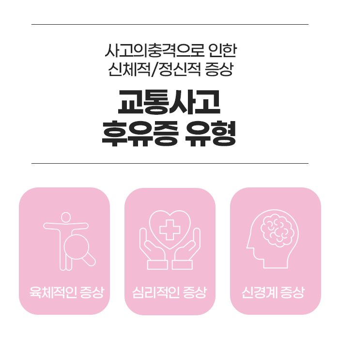 교통사고는 예고 없이 발생하며, 사고 직후에는 외부에서 보이는 상처나 이상이 없어도 시간이 지나면서 다양한 신체적, 정신적 증상이 나타날 수 있습니다. 사고 후에는 스트레스 호르몬의 영향으로 통증이 일시적으로 억제되기 때문에 초기에는 큰 불편함을 느끼지 못할 수도 있지만, 며칠 혹은 몇 주가 지난 뒤에 목, 어깨, 허리, 무릎 등 여러 부위에서 통증이나 뻐근함, 저림 등의 증상이 점차적으로 나타날 수 있습니다. 따라서 사고 직후에는 바로 병원에 가서 상태를 점검하고, 적절한 치료를 받는 것이 중요합니다.