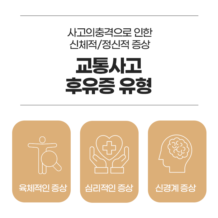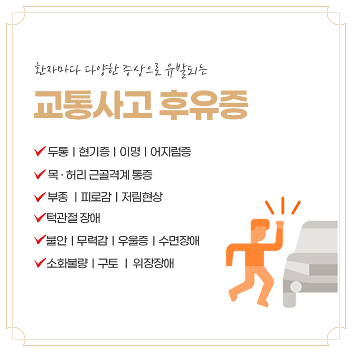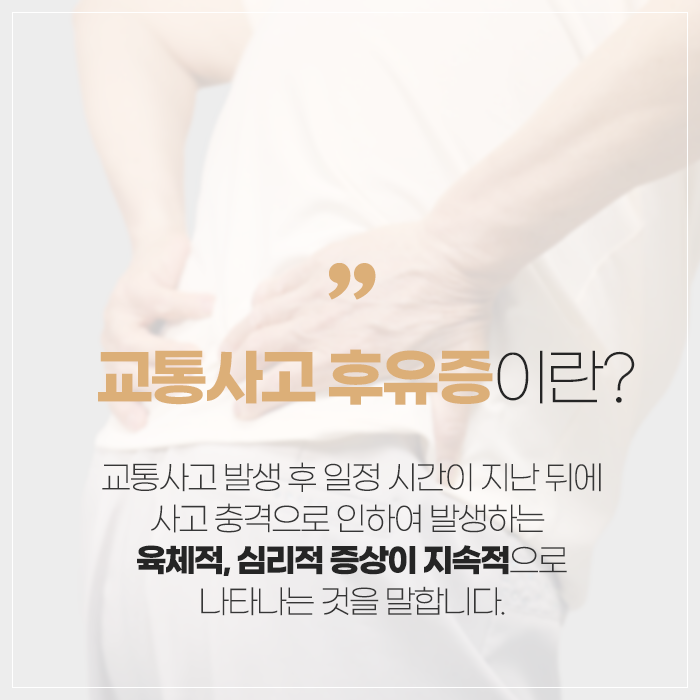 교통사고는 예기치 않게 발생하며, 사고 직후에는 뚜렷한 외상이 없을 수 있습니다. 그러나 시간이 지나면서 다양한 신체적, 정신적 증상이 서서히 나타날 수 있습니다. 사고 후 몸이 급격한 충격을 받으면 스트레스 호르몬이 분비되어 일시적으로 통증을 억제하기 때문에 초기에는 크게 느껴지지 않지만, 몇 일이 지나고 나서 점차적으로 목, 어깨, 허리, 무릎 등 다양한 부위에 통증, 뻐근함, 저림 등의 증상이 생길 수 있습니다. 따라서 사고 직후에는 가능한 한 빠르게 병원에 가서 정확히 상태를 점검하고 필요한 치료를 받는 것이 중요합니다.