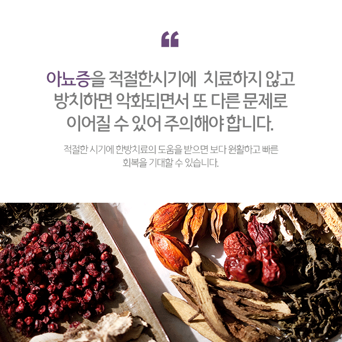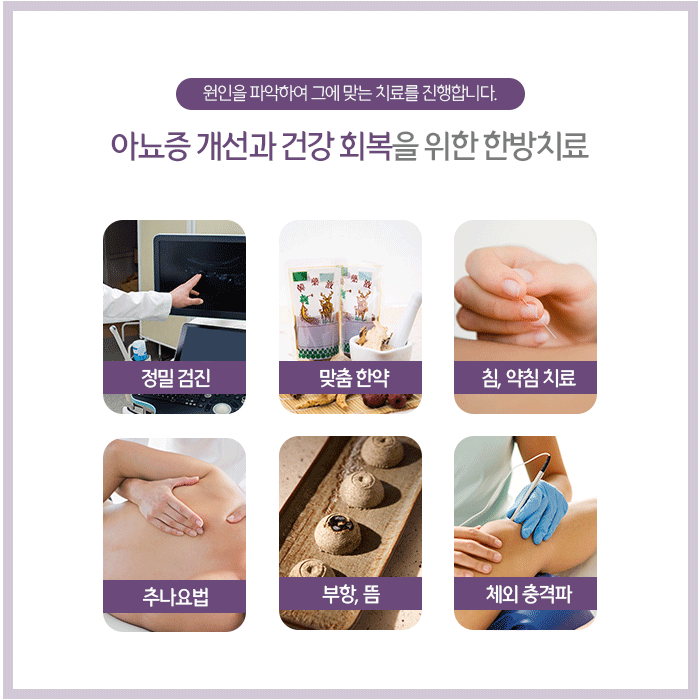 생약 및 한약에서 추출해 정제한 약물을 소량 주입하는 약침치료는 과하게 긴장한 하복부 근육을 이완시키며 방광 주변 어혈을 제거하고 기혈순환을 촉진해 염증을 완화합니다. 그리고 뜸치료와 온열치료를 통해 하복부에 따뜻한 기운을 전달하고 장부기능 개선과 면역력 증진을 돕습니다.