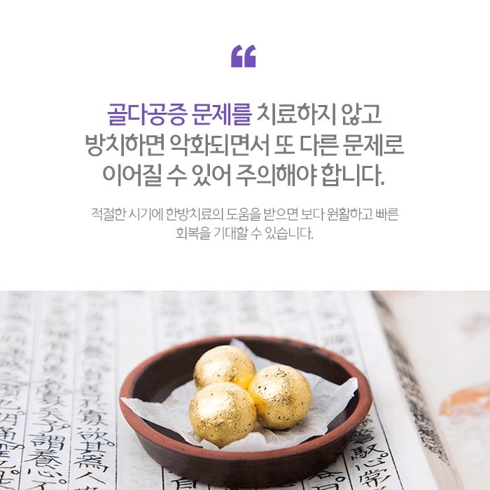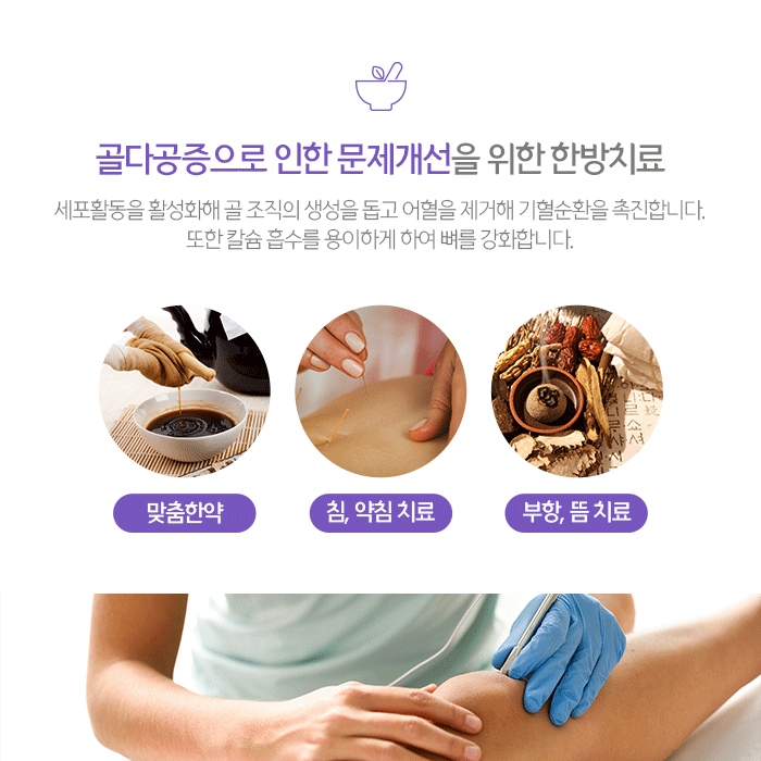 골다공증으로 인한 문제를 개선하기 위해 추나요법, 한약, 약침, 부항, 뜸 등의 복합적인 한방치료를 진행합니다. 체질에 맞는 약재를 구성해 조제되는 한약은 세포활동을 활성화해 골 조직의 생성을 돕고 어혈을 제거해 기혈순환을 촉진합니다. 뼈의 회복과 골밀도 등을 강화하며 건강한 혈액을 생성해 면역력 향상과 전반적인 건강증진을 돕기도 합니다.