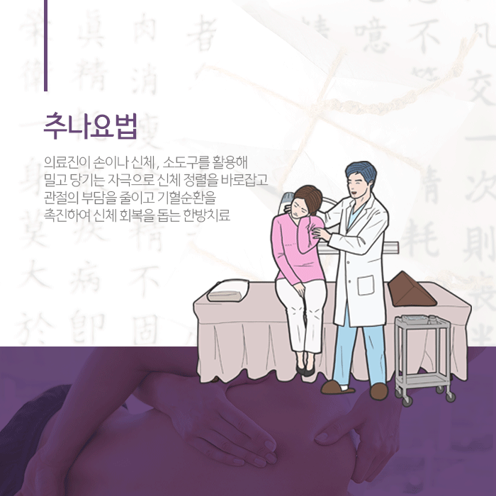 다량의 쑥을 이용한 뜸치료는 하복부 주변 따듯한 기운을 전달하고 원활한 기혈순환을 도와 방광점막 회복을 돕습니다. 체내 순환이 원활하게 이뤄지지 않는 경우 방광문제로 이어질 수 있습니다. 이 경우 진행하는 추나요법은 의료진이 손과 신체, 소도구를 활용해 밀고 당기는 자극으로 신체 정렬을 바르게하며 기혈순환을 원활히해 신체 회복을 돕는 한방치료입니다.
