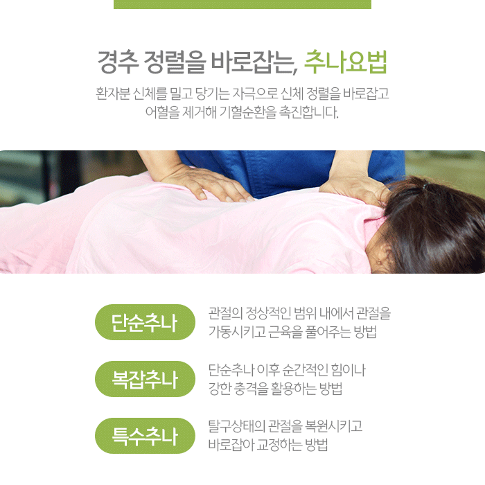 어긋난 척추와 관절을 바르게해서 통증의 원인을 해소하며 아이들의 키성장, 퇴행성질환 치료 등 환자 개개인별 문제를 개선하는데도 도움을 줍니다. 단 개인별 체질과 체형의 특징을 고려하지 않을 경우 부작용이 뒤따를 수 있으므로 경험과 노하우가 많은 숙련된 의료진을 통해 진행하는 것이 좋습니다.