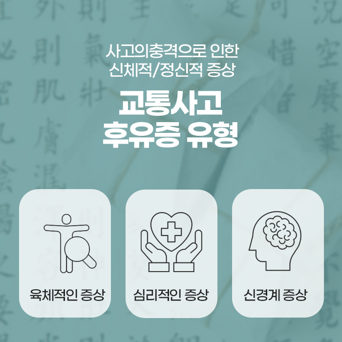 교통사고로 인한 증상은 단순한 신체적 문제가 아니며, 자율신경계의 균형을 깨뜨려 신체 전반에 영향을 미칠 수 있습니다. 이로 인해 소화 불량, 가슴 답답함, 숨 가쁨 등 신체적인 증상은 물론, 정신적 스트레스까지 동반될 수 있어 신체와 정신을 모두 종합적으로 관리해야 합니다. 또한 한의학에서는 사고 후 나타나는 다양한 증상을 기혈 순환 장애와 어혈 생성에 의해 발생한다고 설명합니다.