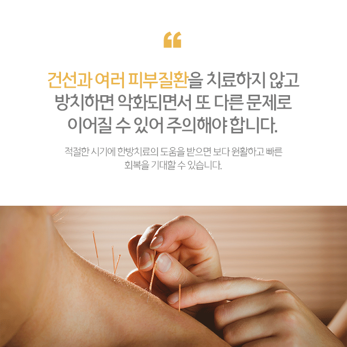 한약은 인증된 약재만 사용하고 피부질환 원인과 증상에 따라 복용횟수와 기간이 달라질 수 있습니다. 침은 혈자리를 자극해 혈류순환을 촉진하며 피부재생을 돕습니다.