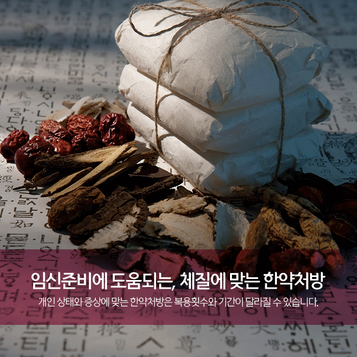또한 임신 후 기력회복을 촉진하여 원활한 모유수유에 도움이 됩니다. 임신을 준비하는 한약은 체질과 현재의 건강 상태, 월경 양상, 배란 상태, 수면과 식습관, 감정 상태 등 전반을 고려해 처방드립니다.