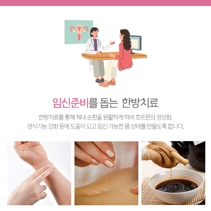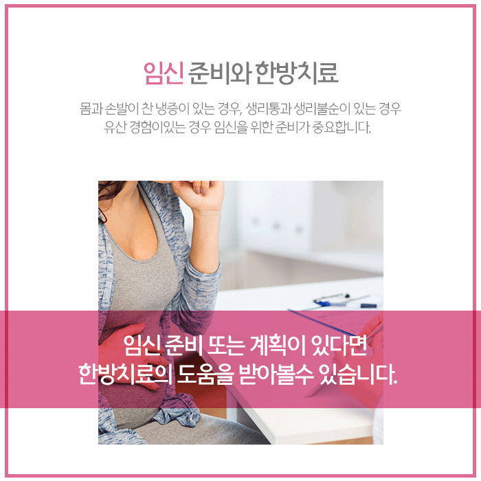 그러므로 임신준비를 하고 있다면 생리통, 생리불순 등의 원인을 파악하고 한방치료의 도움받는 것이 바람직합니다. 건강한 임신을 위해서는 한의학적으로는 기혈이 원활하며, 생식기능이 건강해야 합니다. 그래서 몸 전체적으로는 순환이 잘 돼야 하고, 난자와 정자, 자궁이 건강하도록 한방치료의 도움을 받아볼 수 있습니다.