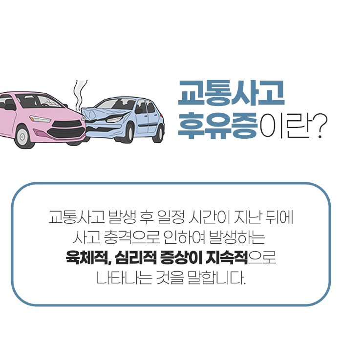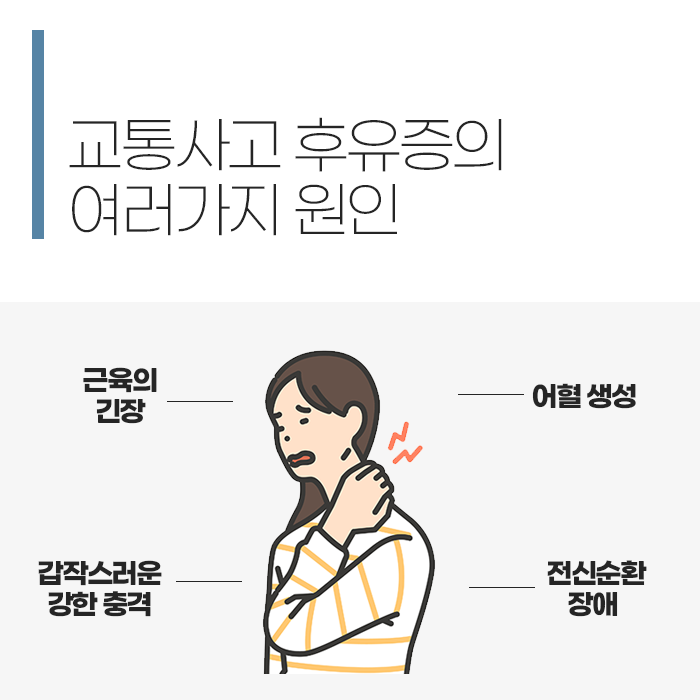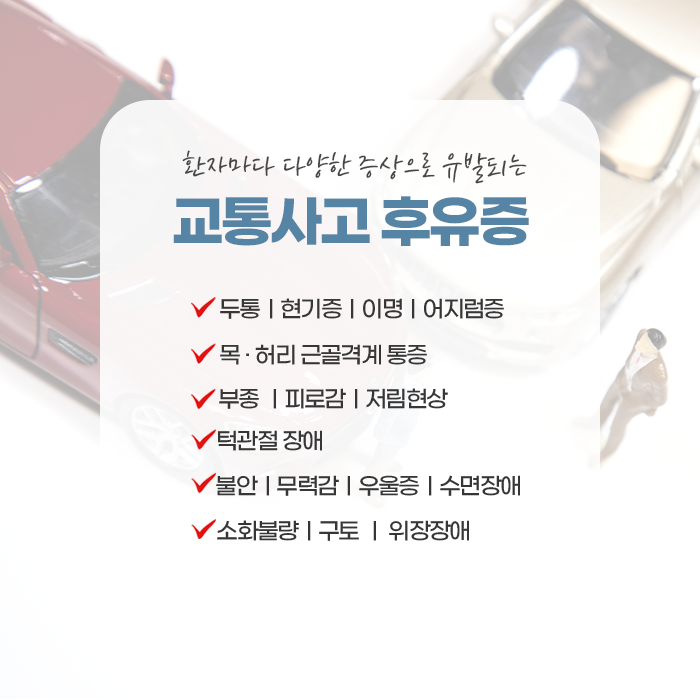 교통사고는 외관상 손상이 없더라도 근육과 인대, 관절 등에 미세한 손상을 유발해 증상이 점차 심화될 수 있으며, 방치할 경우 디스크, 만성 근골격계 통증, 신경 압박 같은 심각한 후유증으로 발전할 위험이 큽니다. 또한 신체뿐 아니라 정신적인 충격으로 인해 불안, 우울, 집중력 저하, 수면장애 등의 심리적 문제도 발생할 수 있어 전인적인 관리가 필요합니다.