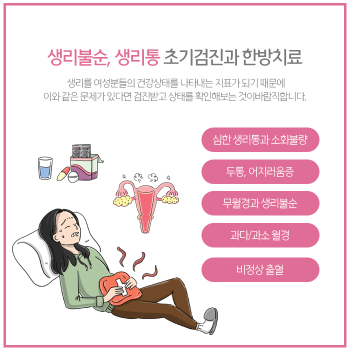 생리통과 함께 복부팽만감, 가슴통증, 여드름, 변비, 설사, 불안, 우울, 집중력장애, 식욕변화, 정서불안, 무월경과 다양한 생리불순 등의 증상이 반복된다면 건강상의 문제일 수 있어 검사받고 한방치료의 도움받는 것이 좋습니다.