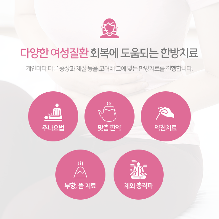 과한 스트레스와 다이어트 등으로 신체 균형이 무너진 경우에도 생리통이 나타날 수 있습니다. 이처럼 다양한 원인으로 발생하는 생리통과 동반되는 문제 개선을 위해 추나요법, 한약, 약침, 부항, 뜸 등의 한방치료 도움을 받아볼 수 있습니다.