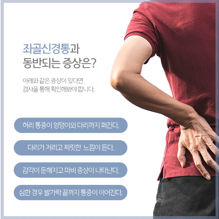 초기에는 단순한 요통이나 피로로 오해하기 쉽지만, 통증이 반복되거나 다리의 감각이 둔해지고 근력이 떨어지는 느낌이 동반된다면 좌골신경통을 의심해볼 수 있습니다. 장기간 방치할 경우 신경 손상이 진행돼 근육 위축이나 보행 장애로 이어질 수 있어 주의해야 합니다.