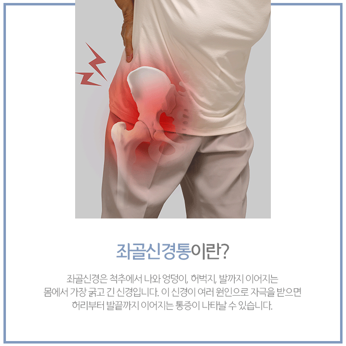 좌골신경은 몸에서 가장 굵고 긴 신경으로, 허리 아래쪽에서 시작해 엉덩이와 허벅지를 지나 발끝까지 이어집니다. 이 신경이 압박되거나 손상되면 허리뿐만 아니라 엉덩이, 허벅지, 종아리, 발끝까지 저릿하고 욱신거리는 통증이 이어지게 되는데, 이를 좌골신경통이라 합니다.