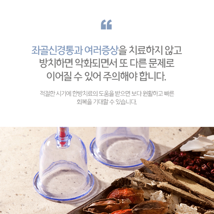 체외충격파는 보통 주2~5회 정도 진행하지만 좌골신경통 원인과 동반되는 문제 등 개인상태에 따라 치료 횟수와 강도를 조정할 수 있습니다. 개인 체질에 맞는 약재를 구성해 조제되는 한약은 어혈을 제거하고 기혈순환을 촉진해 염증과 통증을 줄이면서 좌골신경통 완화와 초기 디스크 회복을 돕습니다.