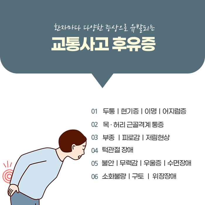 이외에도 사고 후에는 다양한 증상이 복합적으로 나타날 수 있습니다. 귀에서 소리가 울리는 듯한 이명, 머리가 띵한 느낌, 쉽게 피로해지는 전신 권태감, 속이 더부룩하고 메슥거리는 위장 증상 등이 그 예입니다. 이는 사고로 인해 자율신경계의 조절 기능이 흐트러지면서 생기는 반응으로, 단순히 스트레스의 문제로 넘기지 말고 치료와 관리가 병행되어야 합니다.