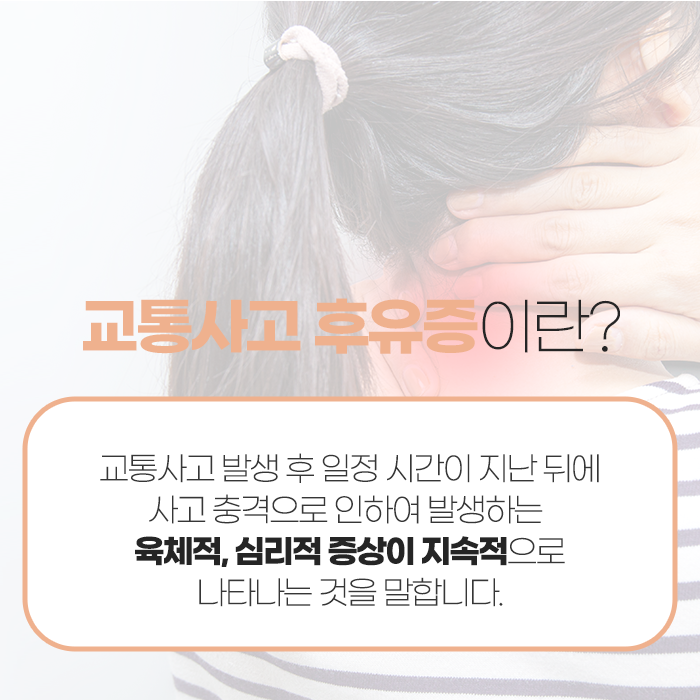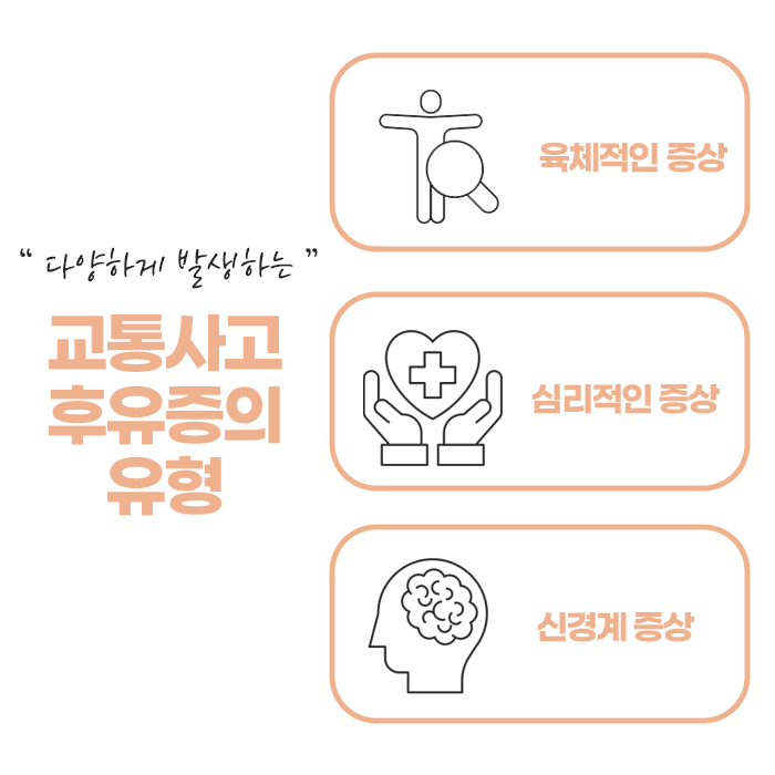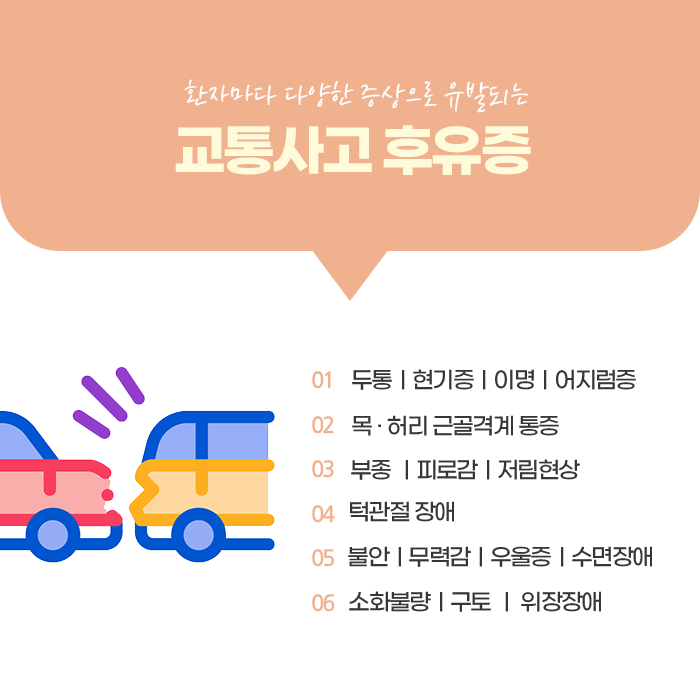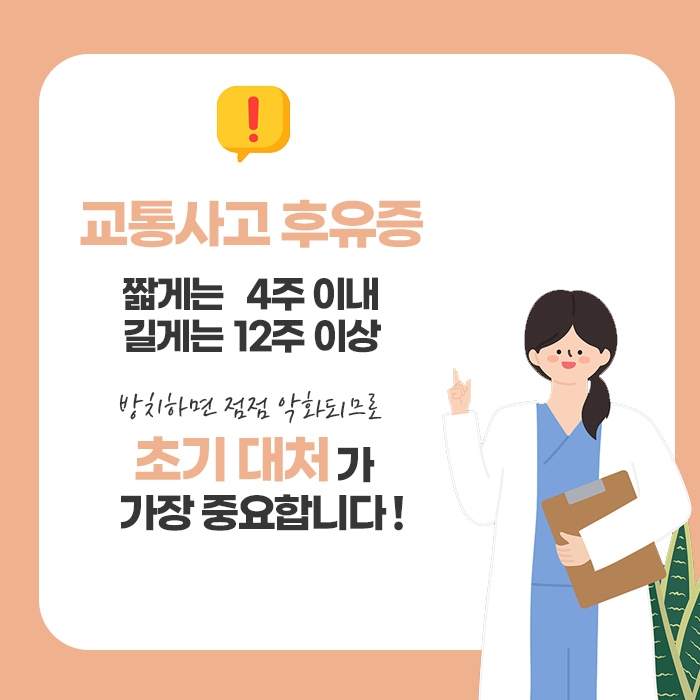 교통사고는 누구에게나 갑작스럽게 일어날 수 있는 예기치 못한 상황이며, 사고 직후에는 눈에 띄는 외상이 없어도 몸 안에서는 다양한 변화가 진행될 수 있습니다. 시간이 흐르면서 신체적, 정신적으로 여러 증상이 서서히 나타날 수 있어 처음에는 이상을 느끼지 못하더라도 주의 깊게 상태를 관찰하는 것이 매우 중요합니다.