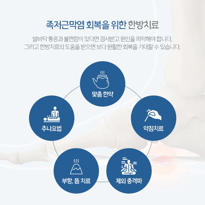 많이 사용되는 부분인 만큼 문제가 발생하면 쉽게 나아지지 않고 재발하는 경우가 많아 초기에 적극적으로 대응하는 것이 바람직합니다. 족저근막염 회복을 위해 한약, 침과 약침, 추나요법, 부항, 뜸 등의 한방치료 도움을 받아볼 수 있습니다.