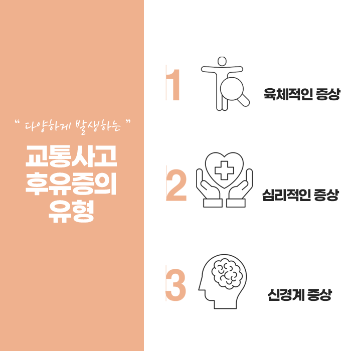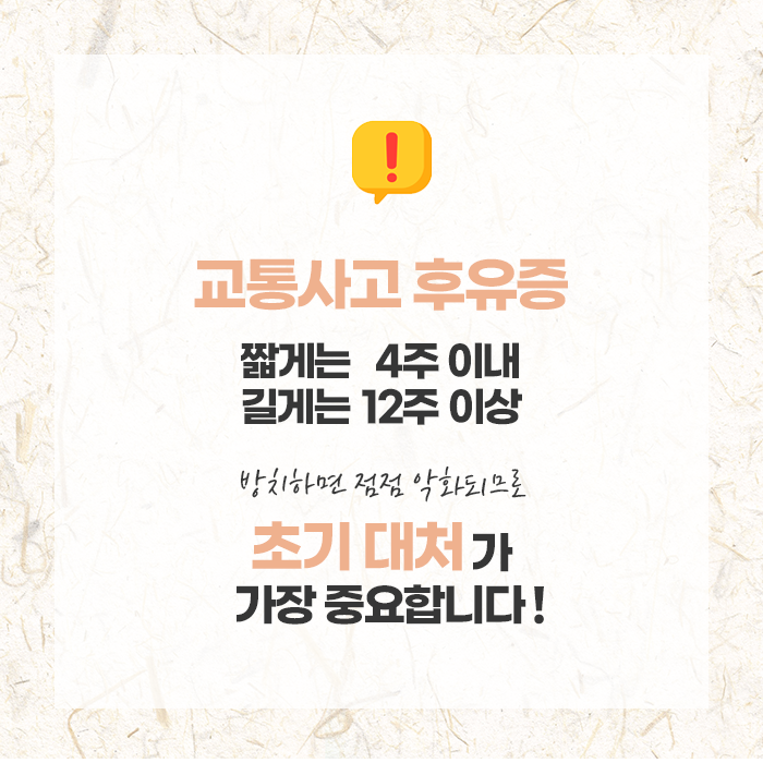 교통사고 후 수주 혹은 수개월이 지나도 계속되는 통증, 뻐근함, 피로감은 단순히 시간이 지나면 해결되는 문제가 아닙니다. 이런 증상은 명확한 신체 신호이며, 반드시 체계적인 검진과 치료가 필요합니다. 특히 사고 당시 경미하다고 생각했던 충격도 시간이 지남에 따라 증상이 심해질 수 있으므로, 초기부터 의료기관에서 정확한 진단과 적절한 치료를 받는 것이 후유증 없는 완전한 회복을 위해 중요합니다.