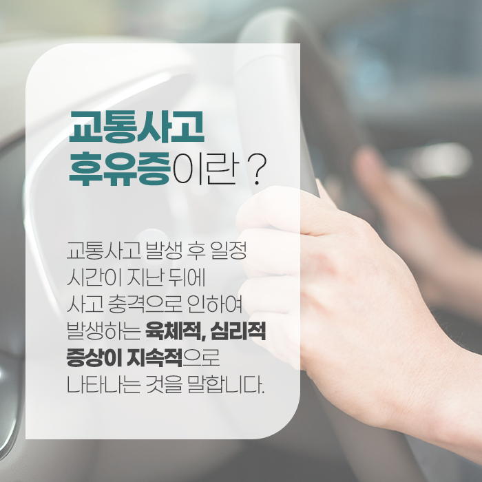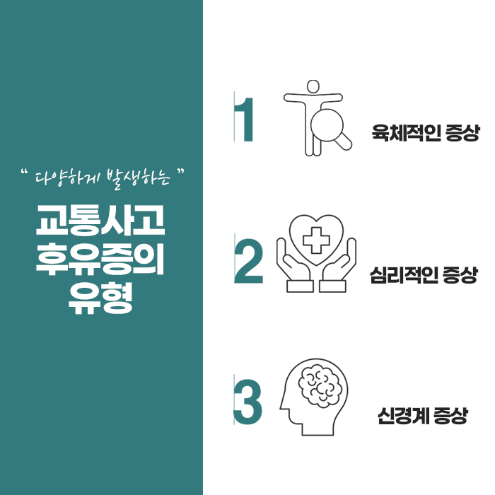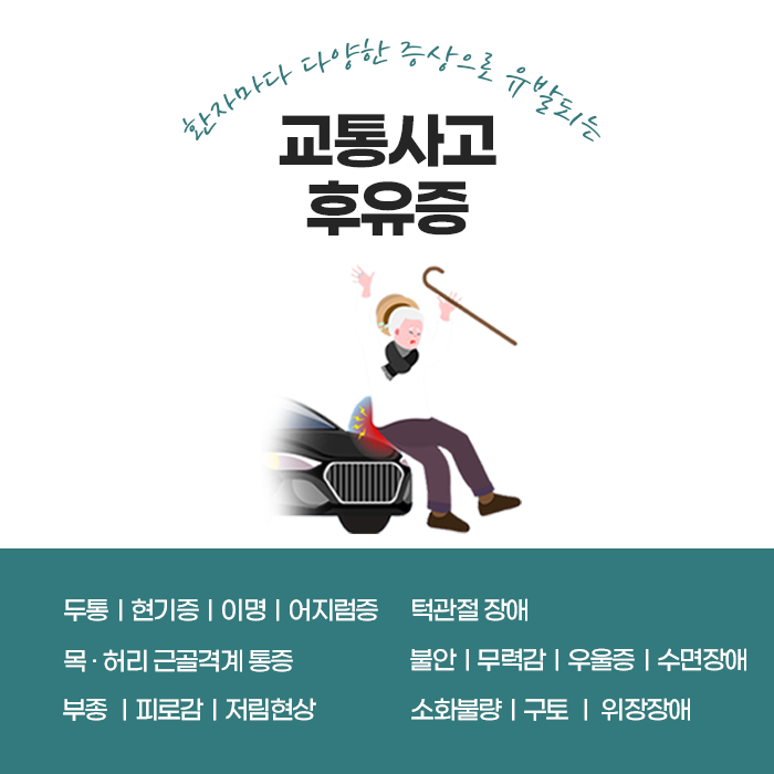 교통사고는 순간적인 충격으로 끝나는 것이 아니라, 이후 오랜 시간 신체와 정신에 영향을 남길 수 있는 사건입니다. 겉으로 보이는 외상이 없다고 해서 안심할 수는 없습니다. 사고 직후에는 긴장 상태로 인해 통증이나 불편함을 제대로 느끼지 못하는 경우가 많지만, 시간이 지나면서 몸의 다양한 부위에서 이상 신호가 나타나기 시작합니다. 목의 통증이나 허리의 뻐근함 같은 초기 증상을 가볍게 여기면, 이후 두통이나 어지럼증, 팔다리 저림, 만성 통증 등으로 이어질 수 있습니다.
