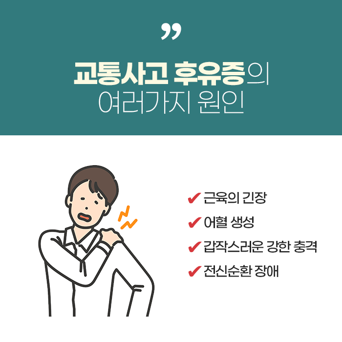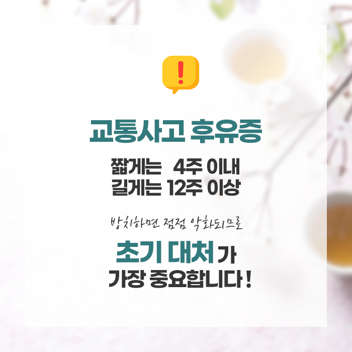 사고 직후 빠르게 적절한 치료를 받는 것이 회복의 핵심이지만, 일정 시간이 지난 후에도 증상이 지속된다면 결코 방치해서는 안 됩니다. 일시적인 호전 상태에서 곧바로 치료를 중단하게 되면, 남은 손상이 만성 통증으로 전환될 수 있으며 제2의 합병증으로 발전될 수 있기 때문에 몸 상태를 지속적으로 살펴보고 꾸준한 치료와 관리가 필요합니다.