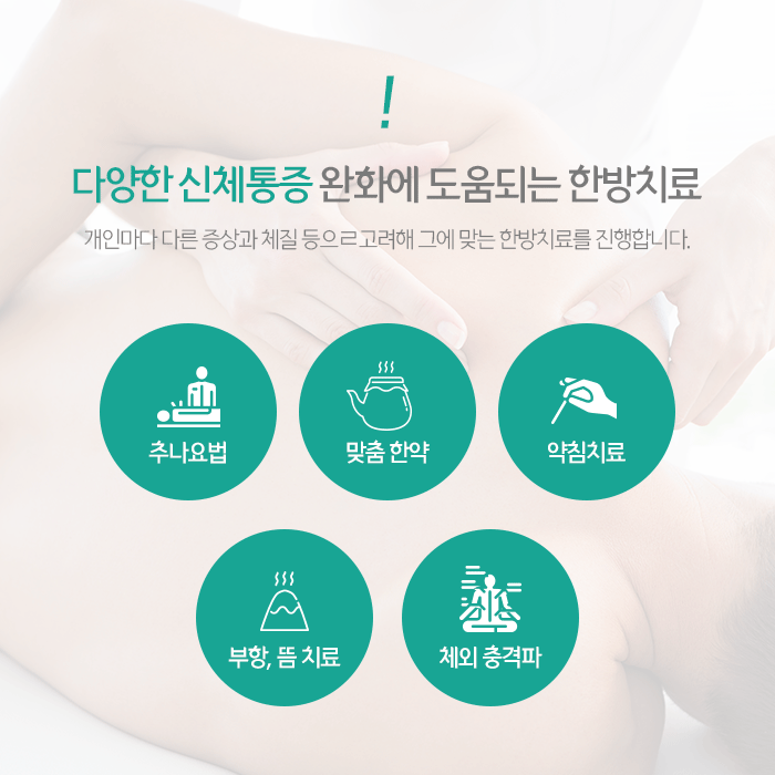 기혈순환을 촉진하며 체내 어혈을 제거하고 염증 및 통증을 완화할 수 있어 통증이나 근골격계 질환에 대한 한방치료입니다. 어긋난 척추 및 관절 정렬을 바르게 잡아 통증의 원인을 해소할 수 있으며 아이들의 키성장, 만성적인 신체 통증, 퇴행성질환 치료 등에도 활용됩니다.