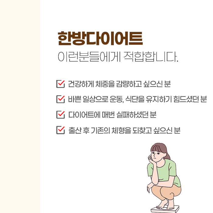 한방에서는 다이어트를 단순히 체중 감량의 과정이 아니라, 신체의 불균형을 회복해 자연스럽게 건강한 상태를 유지하는 과정으로 이해합니다. 이렇게 접근하면 단순히 체중만 줄이는 것이 아니라, 몸의 전반적인 기능이 향상되어 일상생활의 활력이 되살아납니다.