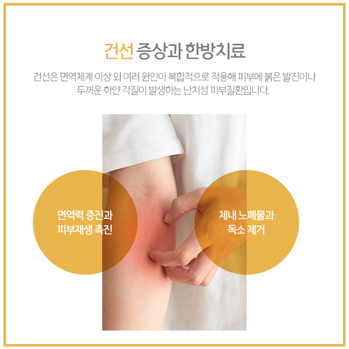 불필요한 열을 내려주며 보다 원활한 피부재생을 돕고 염증을 완화하여 건선증상을 개선합니다. 그리고 건강한 혈액을 생성해 면역력 향상과 신체 회복력을 강화하여 재발을 예방하기도 합니다.