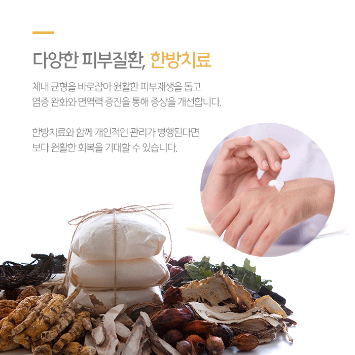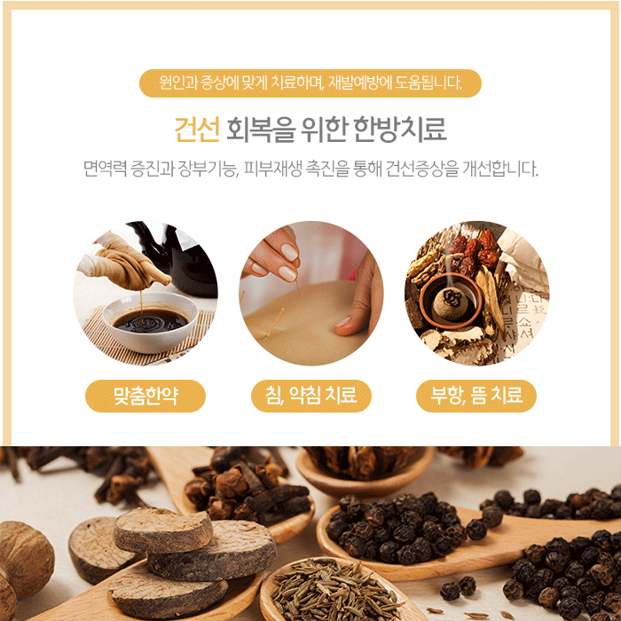 환절기 면역력 증진과 건선 증상을 회복하며 후유증 예방을 위해 추나요법, 한약, 약침, 부항, 뜸 등의 한방치료 도움을 받아볼 수 있습니다. 개인 체질에 맞는 약재를 구성해 조제되는 한약은 체내 독소와 노폐물 등을 원활하게 배출시키며 어혈을 제거하고 기혈순환을 촉진합니다.