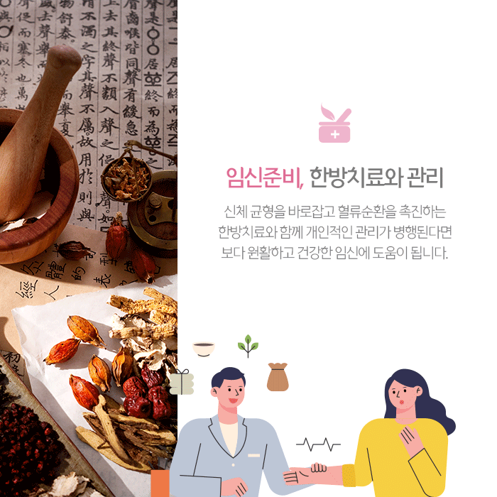 외에도 다양한 한방치료는 개인 체질과 건강상태, 임신이 가능한 몸 상태에 따라 다르게 적용되므로 담당 의료진과 상담을 통해 확인할 수 있습니다. 적절한 시기의 한방치료와 함께 개인적인 건강관리가 이뤄진다면 보다 건강한 임신과 출산을 기대할 수 있습니다.