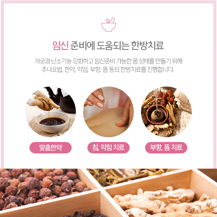 처방드리는 한약은 인증된 약재만 사용하여 직접 제조하고 개인 건강상태와 임신이 이뤄지지 않는 몸 상태에 따라 복용횟수와 기간이 달라질 수 있습니다. 침은 혈자리를 자극해 체내 순환을 촉진하며 균형을 맞추어 원활한 임신을 돕습니다.