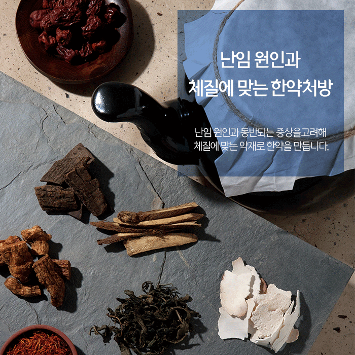그리고 건강한 혈액을 생성해 면역력 향상과 전반적인 건강증진을 돕고 난임과 함께 동반되는 문제를 개선할 수 있습니다. 본원에서 처방드리는 한약은 인증된 약재만 사용하여 직접 제조합니다. 그리고 개인 건강상태와 난임과 동반되는 건강문제 등 문제에 따라 복용횟수와 기간이 달라질 수 있습니다.