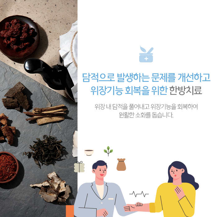 담적병으로 인한 문제 개선을 위해 한약, 침과 약침, 추나요법, 부항, 뜸 등의 한방치료 도움을 받아볼 수 있습니다. 환자분 체질에 맞는 약재를 구성해 조제되는 한약은 위장에 자극을 최소화하면서 원활한 소화를 돕고 주변 염증과 담 독소를 제거해 통증과 여러 증상 완화를 돕습니다.