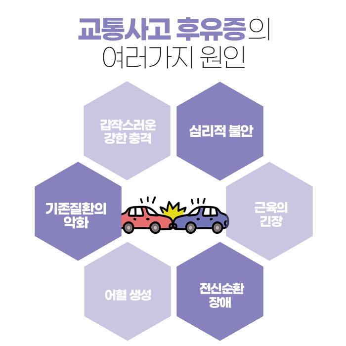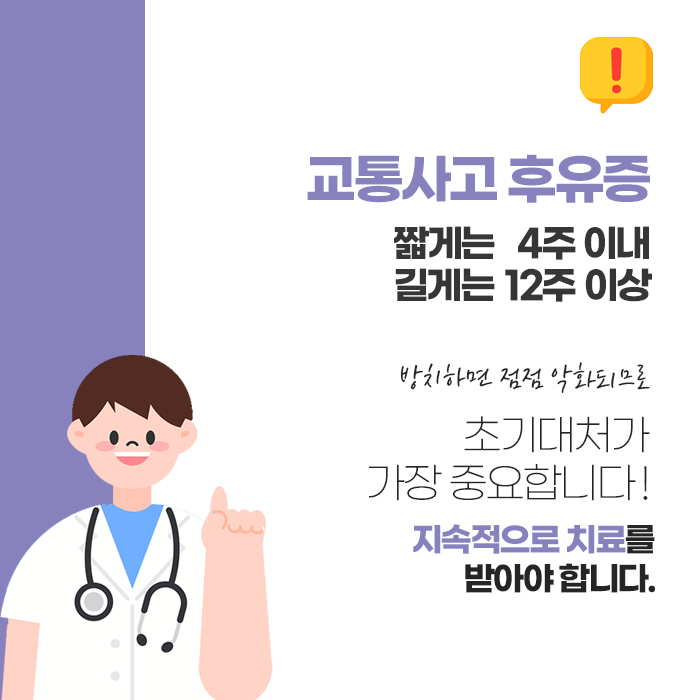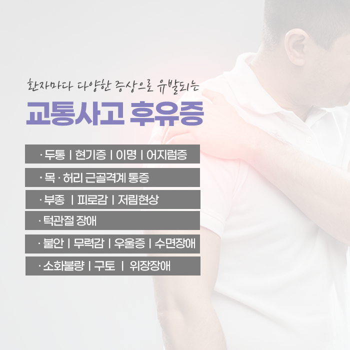 교통사고는 갑작스럽게 발생하지만, 후유증은 체계적인 관리와 치료로 충분히 줄일 수 있으므로 조기에 체계적인 진료를 받는 것이 최선의 방법입니다.