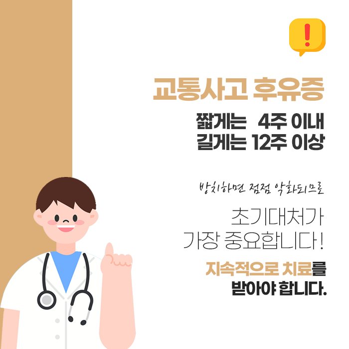교통사고는 예상하지 못한 순간에 발생하지만, 그 이후의 건강은 본인의 선택과 대응에 달려 있습니다. 눈에 보이지 않는 손상도 놓치지 말고, 조기에 진단과 치료를 시작한다면 장기적인 후유증 없이 건강을 되찾을 수 있습니다. 아직 남은 불편함이 있다면 망설이지 말고 바로 치료를 시작하시길 바랍니다.