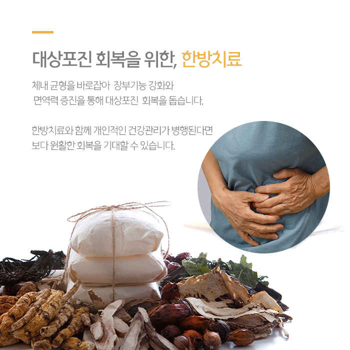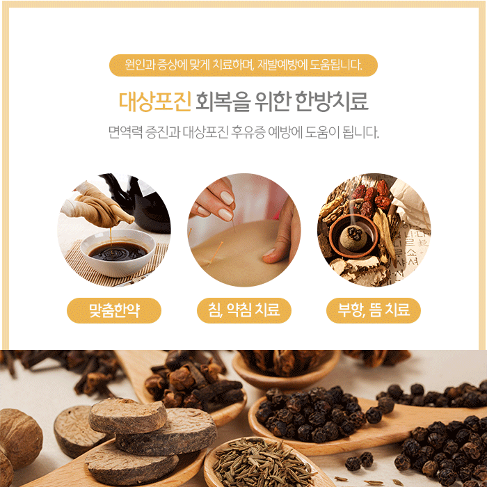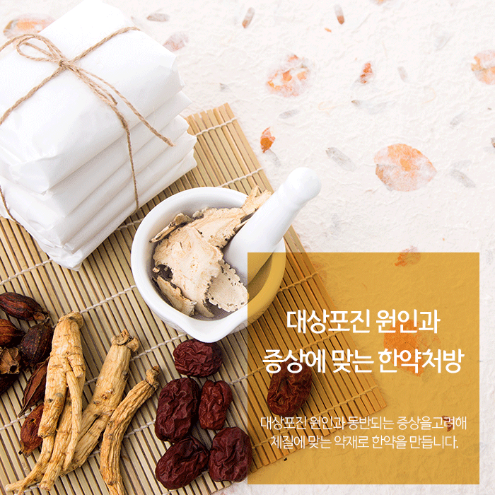 개인 체질에 맞는 약재를 구성해 조제되는 한약은 체내 독소와 노폐물 등을 배출시키며 어혈을 제거하고 기혈순환을 촉진합니다. 또한 수포를 줄이며 피부재생을 돕고 염증을 완화합니다. 그리고 건강한 혈액을 생성해 면역력 향상과 전반적인 건강증진을 돕습니다.