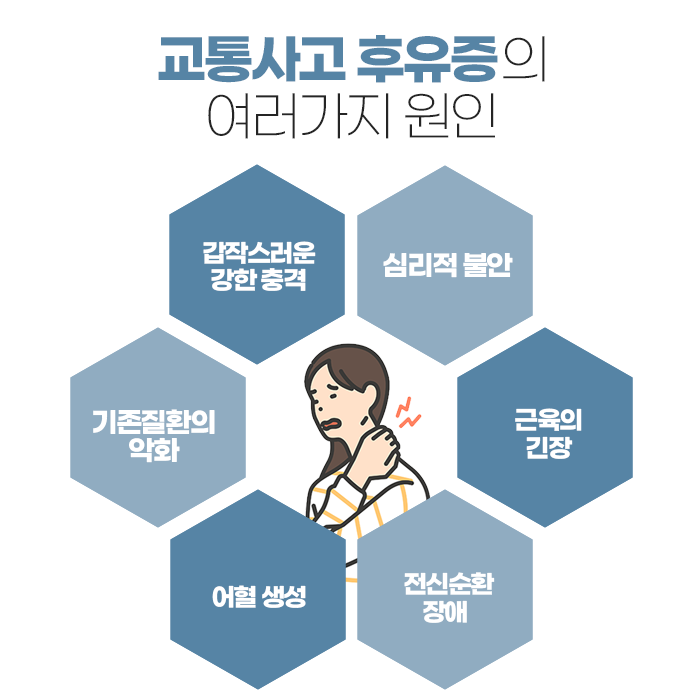 교통사고는 단 몇 초 만에 발생하지만, 그 여파는 오랜 시간 몸속에 남을 수 있습니다. 사고 직후에는 통증이 거의 느껴지지 않아 괜찮다고 생각하기 쉽지만, 시간이 지나면서 목이나 허리, 어깨 등에서 뻐근함과 통증이 서서히 나타나는 경우가 많습니다. 이는 단순한 근육통이 아니라 사고로 인해 몸의 균형이 깨지고 자율신경계가 불안정해진 결과일 수 있습니다.