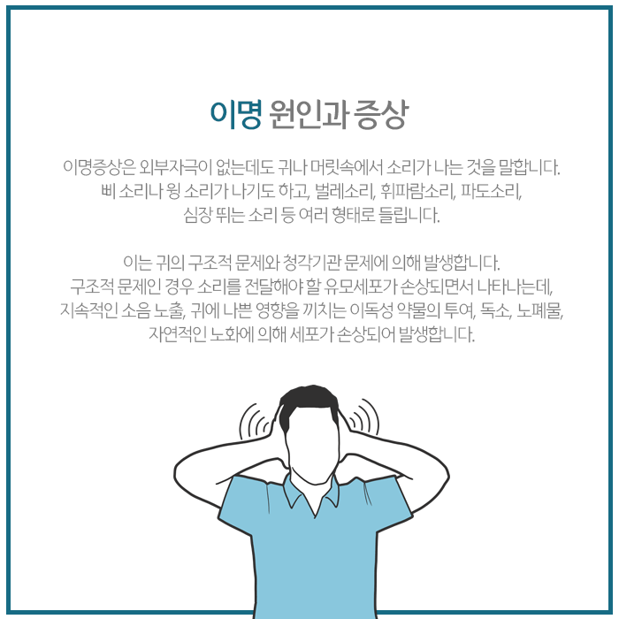 이명증상은 외부자극이 없는데도 귀나 머릿속에서 소리가 나는 것을 말합니다. 삐 소리나 윙 소리가 나기도 하고, 벌레소리, 휘파람소리, 파도소리, 심장 뛰는 소리 등 여러 형태로 들리기도 하며 개인차가 있습니다. 주관적인 현상이기 때문에 증상이 지속될수록 불안감과 스트레스가 가중되기도 합니다.