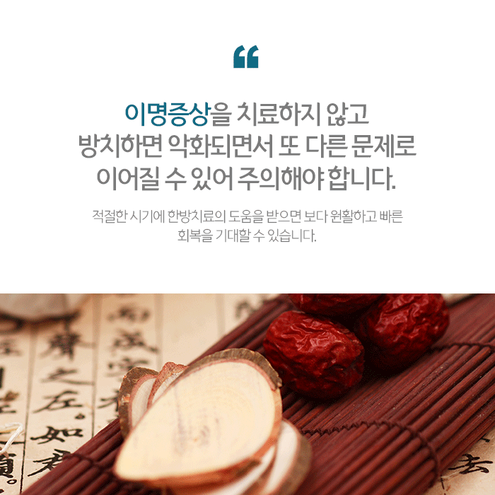그리고 장부기능 강화와 함께 건강한 혈액을 생성해 면역력 향상도 기대할 수 있습니다. 처방드리는 한약은 인증된 최상품 약재만 사용하여 직접 제조하고 이명 원인과 동반되는 증상, 개인 건강상태에 따라 복용횟수와 기간이 달라질 수 있습니다.