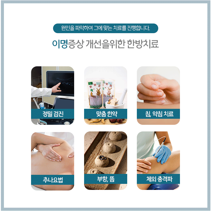 이처럼 다양한 원인으로 발생할 수 있는 이명증상 개선을 위해 추나요법, 한약, 침과 약침, 부항, 뜸 등의 한방치료 도움을 받아볼 수 있습니다. 개인 체질에 맞는 약재를 구성해 조제되는 한약은 어혈을 제거해 기혈순환을 촉진하며 이명증상 완화 및 신체 회복을 돕습니다.