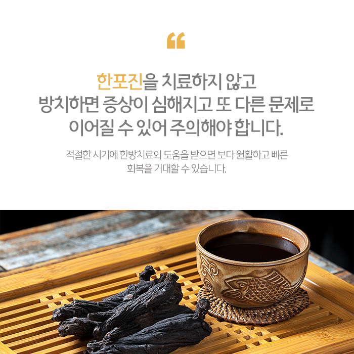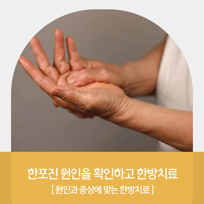 물집이 생기는 위치도 일정하고, 손이나 발 양쪽에 동시에 나타나는 경우가 많고, 어떤 때는 계절을 타거나 스트레스를 받을 때 유독 심해지기도 합니다. 이러한 한포진의 원인은 신체 내부 문제일 수 있습니다. 특히 체액이 정체돼 병리적인 상태로 변해버리면 피부까지 영향을 주게 됩니다. 물집이나 가려움만 있는 게 아니라 함께 소화불량, 불면, 두통, 가슴 두근거림 같은 전신 증상이 동반되는 경우도 있어 검사받아보는 것이 좋습니다.