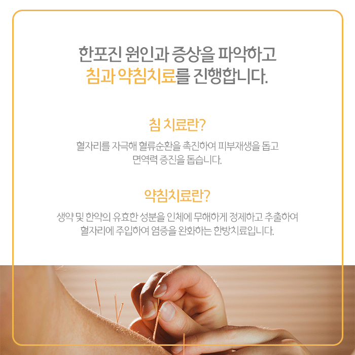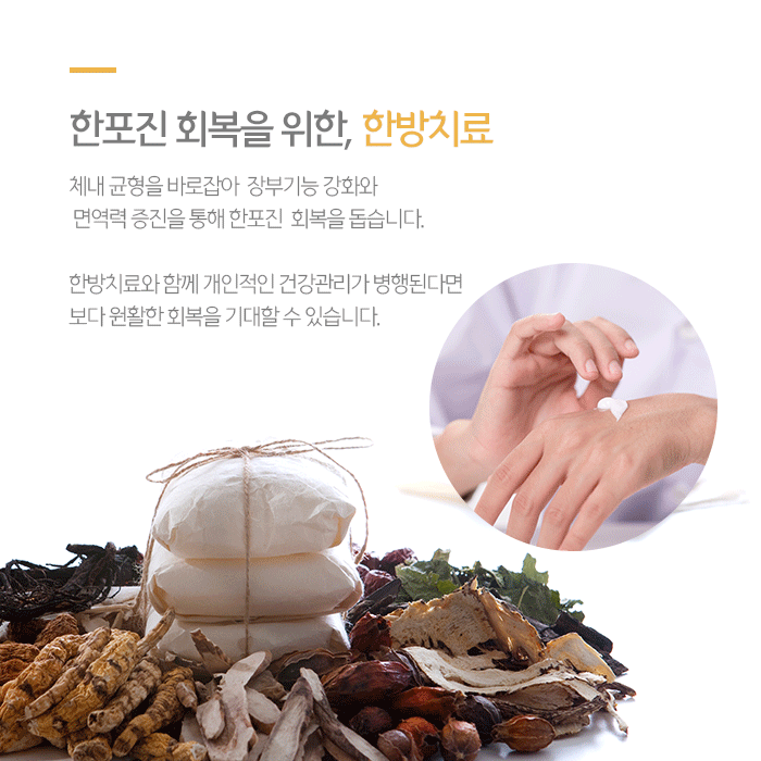 주입되는 약물에 따라 여러 방법이 있으며 개인 체질과 사용되는 약물의 알레르기 반응을 고려해 진행하는 한방치료입니다. 다량의 쑥을 활용한 뜸 치료는 면역력 증진과 장부기능을 강화하며 한포진 증상회복에 도움이 됩니다. 그리고 부항은 음압방식으로 어혈을 제거하여 혈류순환 촉진과 신체 균형을 바로잡아 면역력 증진에 도움이 됩니다.