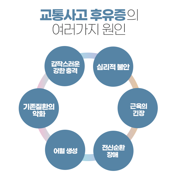 교통사고는 단 한순간의 충격으로 발생하지만, 그 여파는 생각보다 오래 신체에 남습니다. 사고 직후에는 큰 이상이 없어 보이더라도, 몸속에서는 이미 근육과 인대, 신경이 미세한 손상을 입은 상태일 수 있습니다. 특히 아드레날린이 급격히 분비되는 사고 직후에는 통증이 둔화되어 스스로 괜찮다고 느끼기 쉽지만, 시간이 지나 호르몬 작용이 사라지면 목이나 어깨, 허리, 무릎 등에서 통증이 서서히 나타납니다. 이때 가벼운 통증이라도 방치하면 만성적인 불편함으로 이어질 수 있기 때문에, 사고 직후 신속히 정확한 진단과 치료를 받는 것이 매우 중요합니다. 사고 이후 흔히 나타나는 증상으로는 목의 뻣뻣함, 허리 통증, 어깨 결림, 두통, 어지럼증, 손발 저림 등이 있습니다.