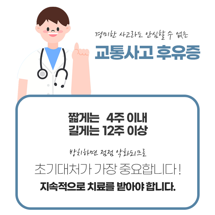교통사고 후에는 증상이 경미하더라도 초기에 치료를 시작하는 것이 무엇보다 중요합니다. 처음에는 단순한 근육통으로 느껴질 수 있으나, 시간이 지나면 근육과 인대의 염증이 만성화되어 통증이 깊어질 수 있습니다. 조기 치료를 통해 손상 부위의 회복을 촉진하면 만성 통증, 관절 불균형, 신경통 등으로 악화되는 것을 예방할 수 있습니다.