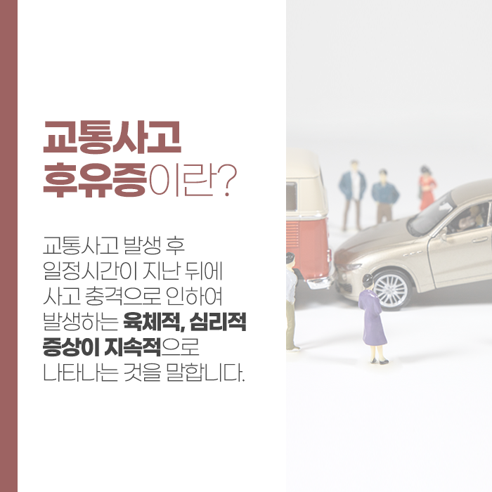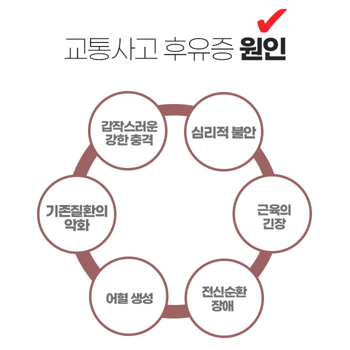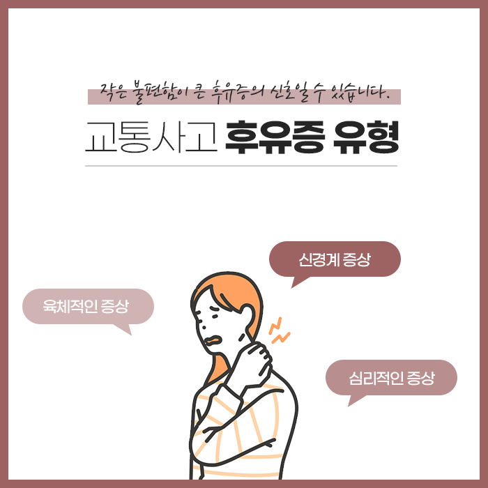 예기치 못한 교통사고는 단 한 번의 순간으로 끝나는 일이 아니며, 그 여파는 생각보다 오랫동안 신체에 남습니다. 겉으로 드러난 외상이 없더라도, 충격은 근육과 인대, 신경, 혈관 등에 미세한 손상을 남겨 시간이 지나면서 통증과 불편감을 유발하게 됩니다. 사고 직후에는 아드레날린과 같은 스트레스 호르몬의 영향으로 통증이 잘 느껴지지 않지만, 긴장이 풀리면 그동안 눌려 있던 통증이 서서히 드러나게 됩니다. 특히 목, 어깨, 허리, 무릎은 충격을 직접 받기 쉬운 부위로, 초기에는 단순한 뻐근함 정도로 느껴지더라도 방치하면 만성적인 통증으로 이어질 수 있습니다.