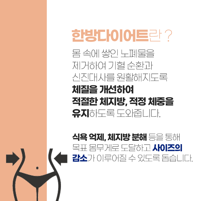 또한 다이어트 과정에서 가장 주의해야 할 점은 근육 손실 방지입니다. 근육량이 줄면 기초대사량이 떨어져, 감량 후에도 쉽게 체중이 다시 늘 수 있습니다. 따라서 체력에 맞는 근력운동과 유산소 운동을 병행하며, 무리하지 않되 꾸준히 실천하는 것이 좋습니다. 지방은 줄이되 근육은 유지하는 것이 건강한 체형의 기본이며, 이를 통해 탄력 있고 균형 잡힌 몸으로 변화할 수 있습니다. 한방 다이어트는 빠르게 살을 빼는 것이 목표가 아닙니다. 꾸준한 체질 개선을 통해 몸이 스스로 건강한 리듬을 되찾고, 체중이 서서히 조절되는 것이 이상적입니다.