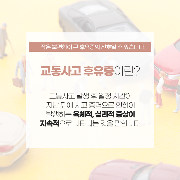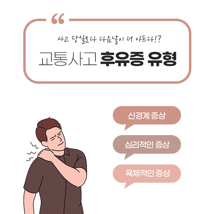 교통사고는 순간적인 충격이지만, 그 영향은 몸 곳곳에 은근하게 남아 시간이 지난 뒤에야 모습을 드러내기도 합니다. 사고 직후에는 외상이 없고 움직임에 문제가 없다고 느껴도, 서서히 뒷목이 뻐근해지고 허리가 무거워지거나 몸 전체가 쉽게 피로해지는 경우가 많습니다. 이는 충돌 당시 몸이 본능적으로 긴장하며 근육을 강하게 수축시키고, 신경계가 충격을 빠르게 처리하기 위해 예민한 상태로 변하기 때문입니다. 이러한 변화가 즉시 풀리지 않으면 사고 후 며칠에서 몇 주 동안 통증·저림·무기력감 같은 형태로 이어질 수 있습니다. 그래서 “처음엔 괜찮았는데 시간이 지나니 아프기 시작했다”는 말을 많은 분들이 하게 되는 것입니다.