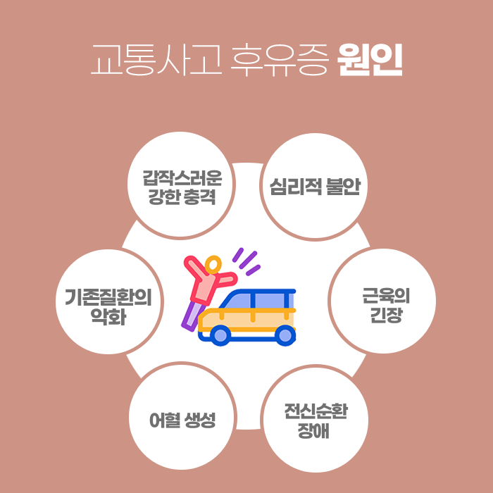 한의학에서는 교통사고 후 느껴지는 불편함을, 충격으로 인해 몸속 순환이 흐트러지고 기혈의 움직임이 막힌 상태로 봅니다. 외상 후에는 어혈이 생기기 쉬운데, 이 찌꺼기 같은 순환 장애가 남아 있으면 통증이 오래 지속되거나 일정하지 않은 형태로 나타나는 일이 많습니다. 그래서 초기부터 순환을 원활하게 하고 긴장된 조직을 풀어주는 과정이 무엇보다 중요하다고 여겨집니다.