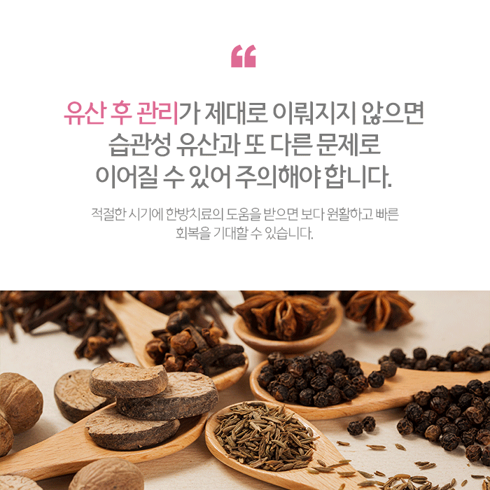 유산은 여성분들의 몸과 함께 정신, 마음에도 큰 충격과 상처를 남기게 합니다. 그런데 유산후 관리를 제대로 하지 않으면, 정상적인 생활로 회복하는데 어려움이 생길 수 있고 이후 건강에 많은 영향을 미칠 수 있으므로, 본인은 물론 주변의 의식적인 노력과 함께 적절한 시기의 한방치료가 중요합니다.