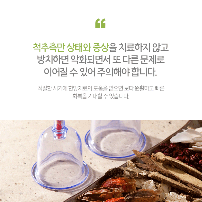 외에도 다양한 한방치료는 골반 및 허리통증 원인, 척추틀어짐으로 발생하는 문제에 따라 다르게 적용되므로 검사 후 담당 의료진과 상담을 통해 확인할 수 있습니다. 척추 변형으로 인한 다양한 문제는 단시간 내 나아지지 않고 재발할 수 있기 때문에 적절한 시기의 한방치료와 함께 개인적인 관리가 필요합니다.