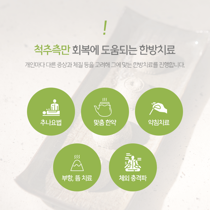 한약성분에서 추출해 정제한 약물을 주입하는 약침은 척추 주변에 통증을 유발하는 염증을 해소하고 손상된 신경을 회복하는데 도움이 됩니다. 또한 뜸, 부항을 이용해 과한 긴장을 풀어주며, 어혈을 제거해 혈액순환을 촉진하고 염증과 통증을 완화합니다.