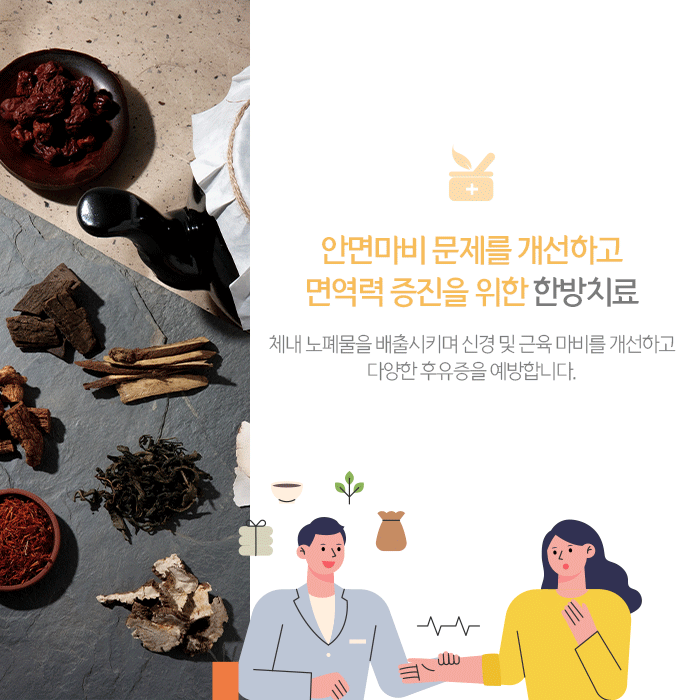 체질에 맞는 약재를 구성해 조제하는 한약은 안면부 주변 마비된 부분의 기혈순환을 촉진하고 신경을 재생시켜 얼굴의 자연스러운 움직임을 회복시켜줍니다. 그리고 새로운 혈관을 형성해 면역력과 세포재생력을 향상시켜 전반적인 건강증진도 기대할 수 있습니다.