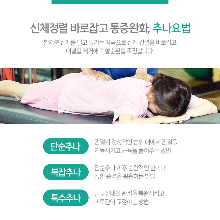 손상된 팔꿈치 주변 조직의 재생을 돕고 기능회복을 돕는 추나요법은 개인마다 다른 체형을 고려해 문제가 되는 정확한 부분을 자극해야 하므로 의료진의 정밀한 기술이 요구됩니다. 그래서 경험과 노하우가 많은 숙련된 의료진을 통해 진행하는 것을 추천드립니다.